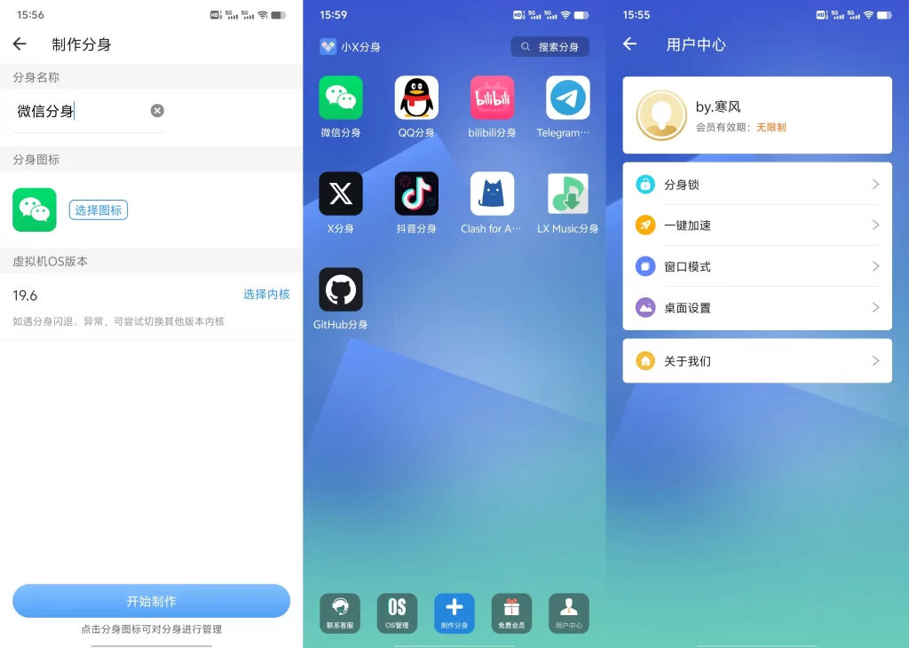小X分身 原多开分身,支持应用双开、应用多开、微信多开、游戏多开,是一款基于安卓虚拟化技术(chaos虚拟引擎)的手机分身类工具,帮助用户解决多账号同时使用问题,已解锁VIP