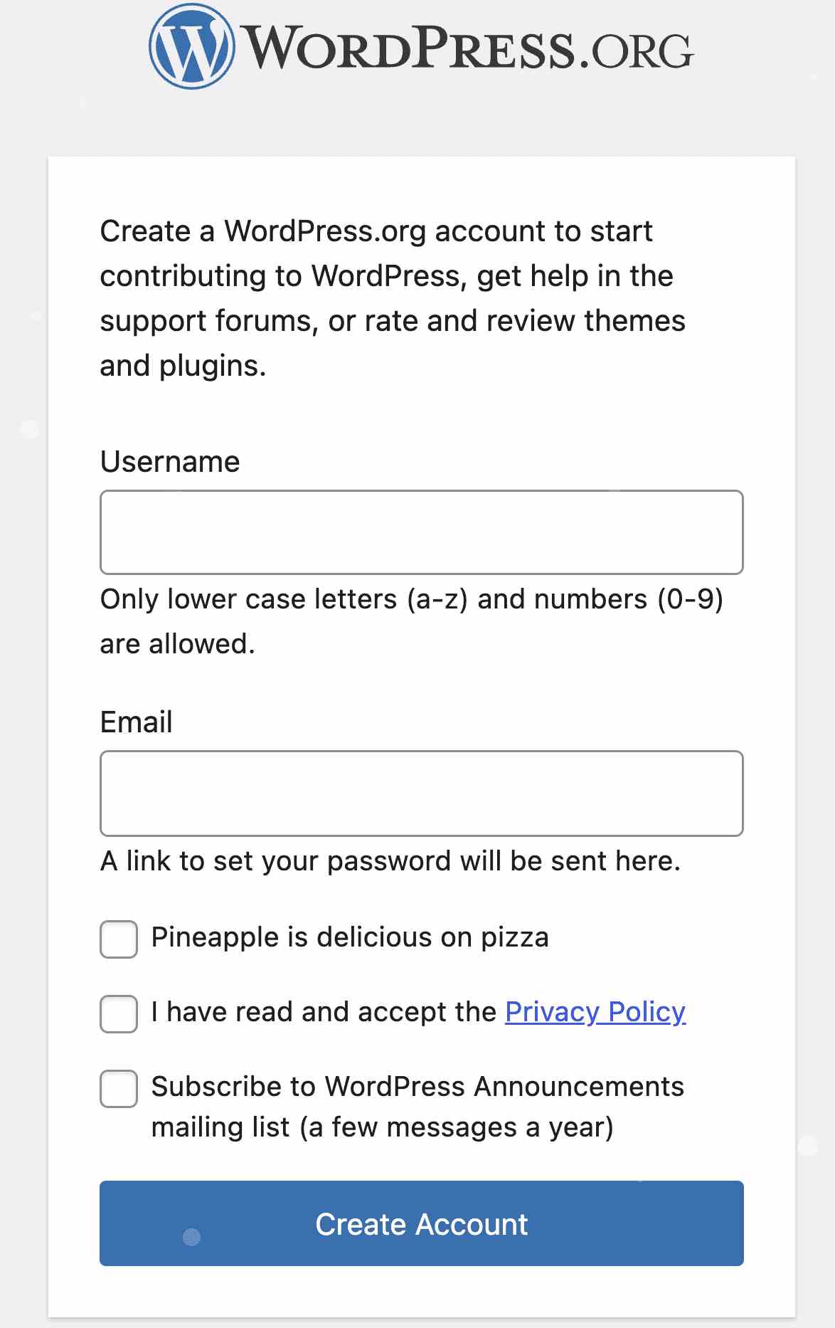 要创建一个新的账户,用户必须提供他们的电子邮件地址和用户名。注册表单包括三个复选框:确认接受隐私政策(必选项)、订阅 WordPress 公告邮件列表,以及那个臭名昭著的菠萝披萨选项。只有接受隐私政策是继续注册所必需的。